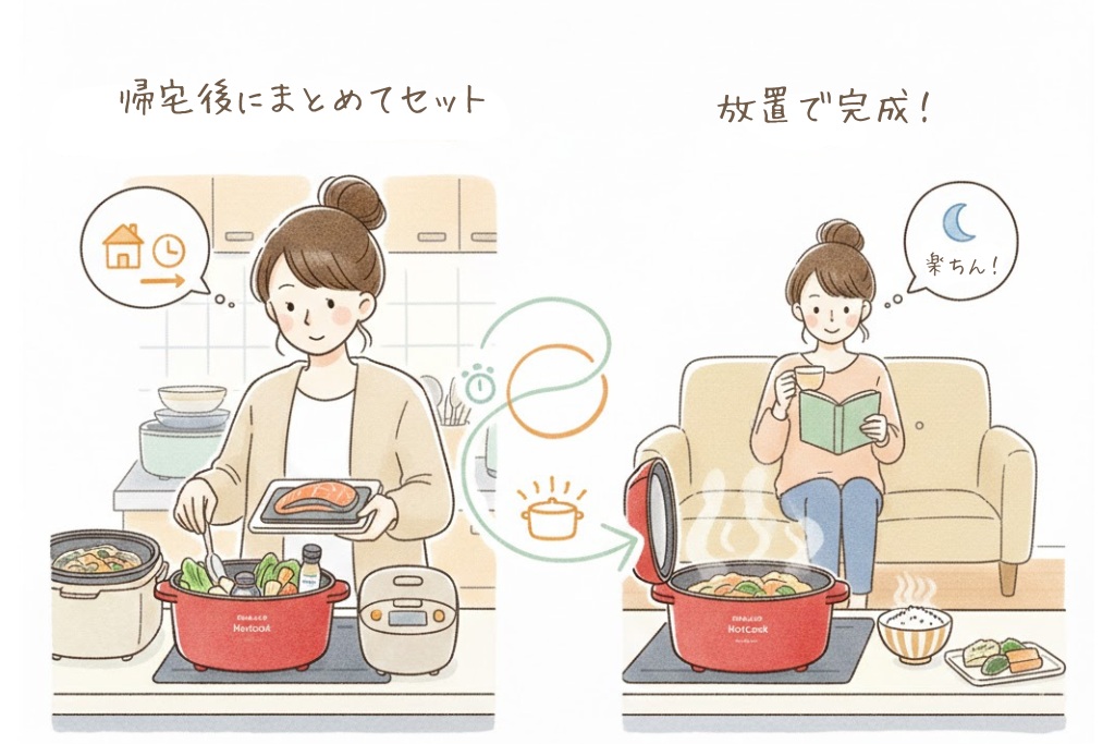 朝にメインを仕込んでおく**「先行投資型」でも、帰宅後に一気に仕上げる「一撃型」**でも、どちらが正解ということはありません。その日の自分の体力やスケジュールに合わせて、ホットクックという「料理代行スタッフ」を賢く頼ってみてください。