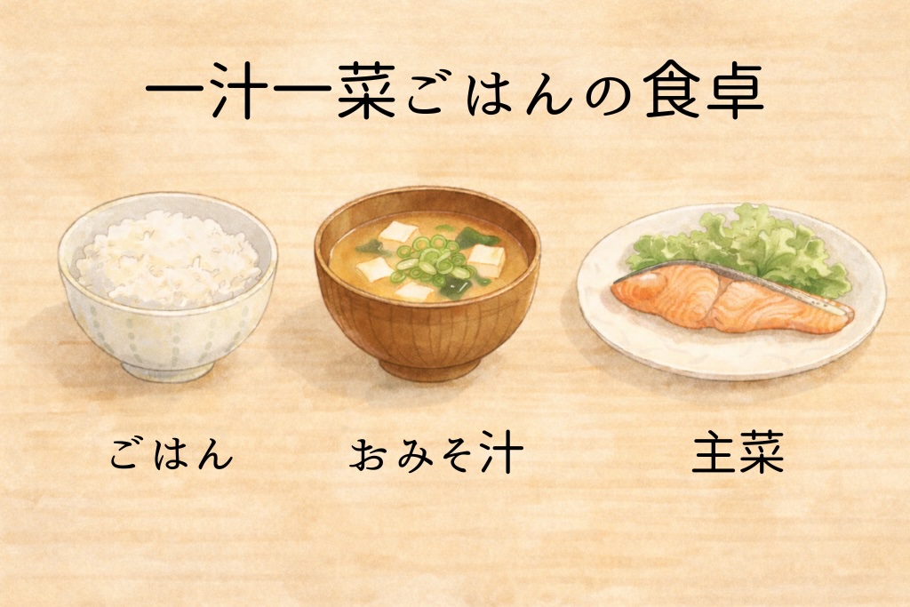 一汁一菜とは、ご飯・汁物・おかず1品だけというシンプルな食事スタイルのこと。