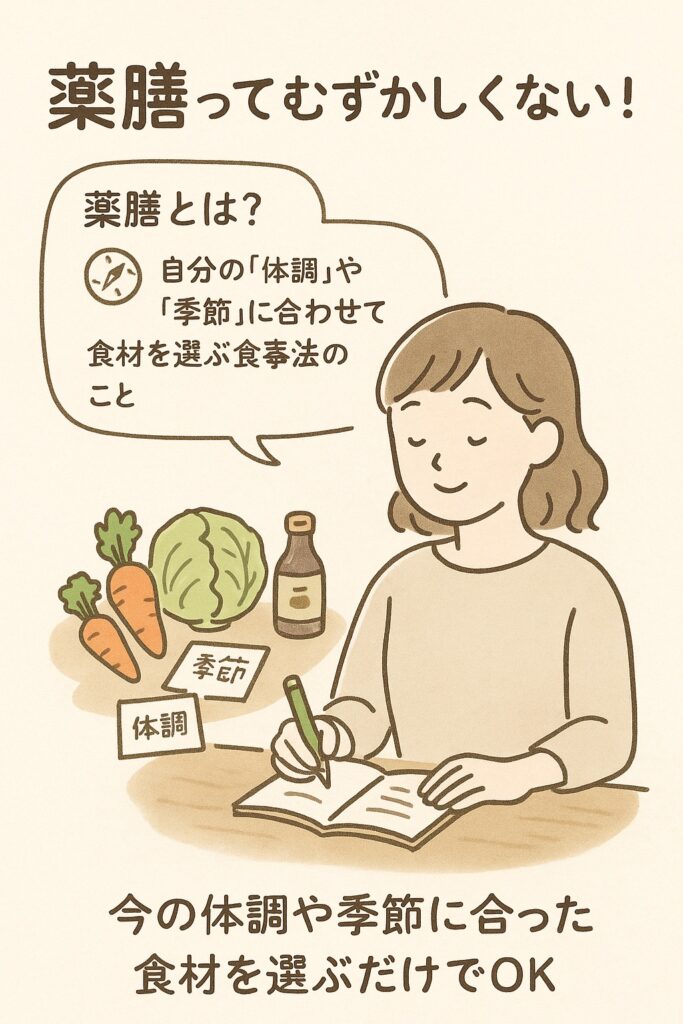 薬膳(やくぜん)とは、中医学(中国伝統医学)をもとに、体質や季節に合わせて食材を選び、心と体のバランスを整える食事法のこと。