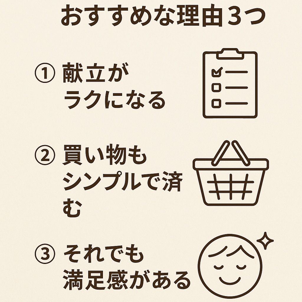 献立を考えるのは「メイン料理」だけなので、買い物・献立・調理の負担がぐっと軽くなるのが特徴です。