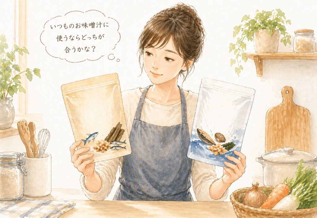ただ、毎日の味噌汁に使うなら、やすまるだしの「食材の邪魔をしない旨み」が使いやすいと感じています。